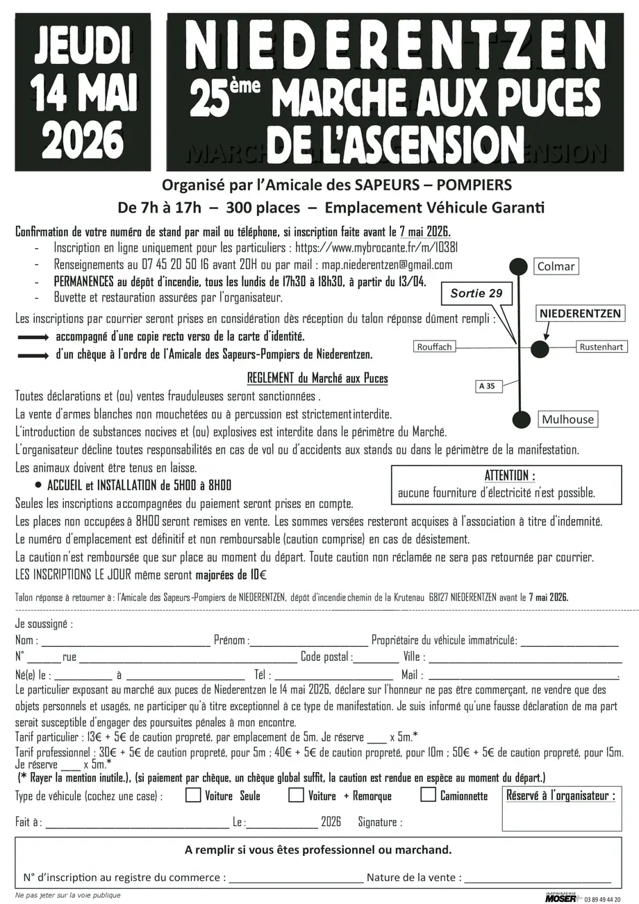 L'Amicale des Sapeurs-Pompiers de Niederentzen organise son 25ème Marché aux Puces de l'Ascension.