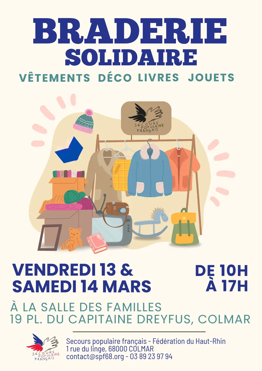 En attendant l'arrivée du printemps, les bénévoles du Secours populaire du Haut-Rhin ont le plaisir de vous convier à leur braderie solidaire. Celle-ci se déroulera le vendredi 13 et samedi 14 mars 2026, de 10h à 17h à la Salle des familles de Colmar.