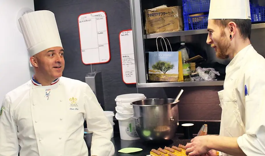 Au fond à droite, nous remarquons une jeune femme dans une petite chambre froide vitrée. « Elle travaille le poisson. La pièce est à 4°, pour garder la fraîcheur du produit », dit-il en pointant du doigt le thermomètre à affichage digital au-dessus de la porte. Si d'aventure vous dégustez un omble chevalier au Chambard, n'oubliez jamais qu'une jeune femme aura passé 3 heures dans une pièce glaciale pour votre bon plaisir ! Une fabuleuse odeur de chocolat nous amène à la rencontre d'Auguste, chef pâtissier de 31 ans, tatouages et écarteurs dans chaque oreille. Ne vous laissez pas berner par son apparence de festivalier échappé des Eurockéennes. Avec une minutie extrême, il réalise de délicats miracles qui se produiront au moment du dessert. Pour rire, nous lui demandons si les glaces c'est du Miko. « Goûtez ce sorbet. Pas trop de sucre, c'est l'astuce. Les glaces, on les fait les jours où on a un peu moins de monde ». Olivier Nasti, d'humeur badine, vient lui raconter la fois où il a balancé des litres de chantilly sur ses collègues quand il travaillait à l'Auberge de l'Ill.
