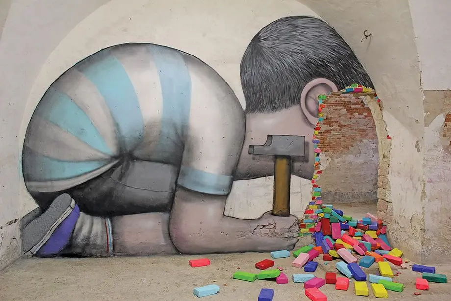 Les artistes se sont fait un plaisir de jouer avec les contraintes et les possibilités de ce lieu brut, comme Seth qui a agenouillé un de ses enfants sans visage auprès d’un trou béant, éparpillant au sol des briques de toutes les couleurs.