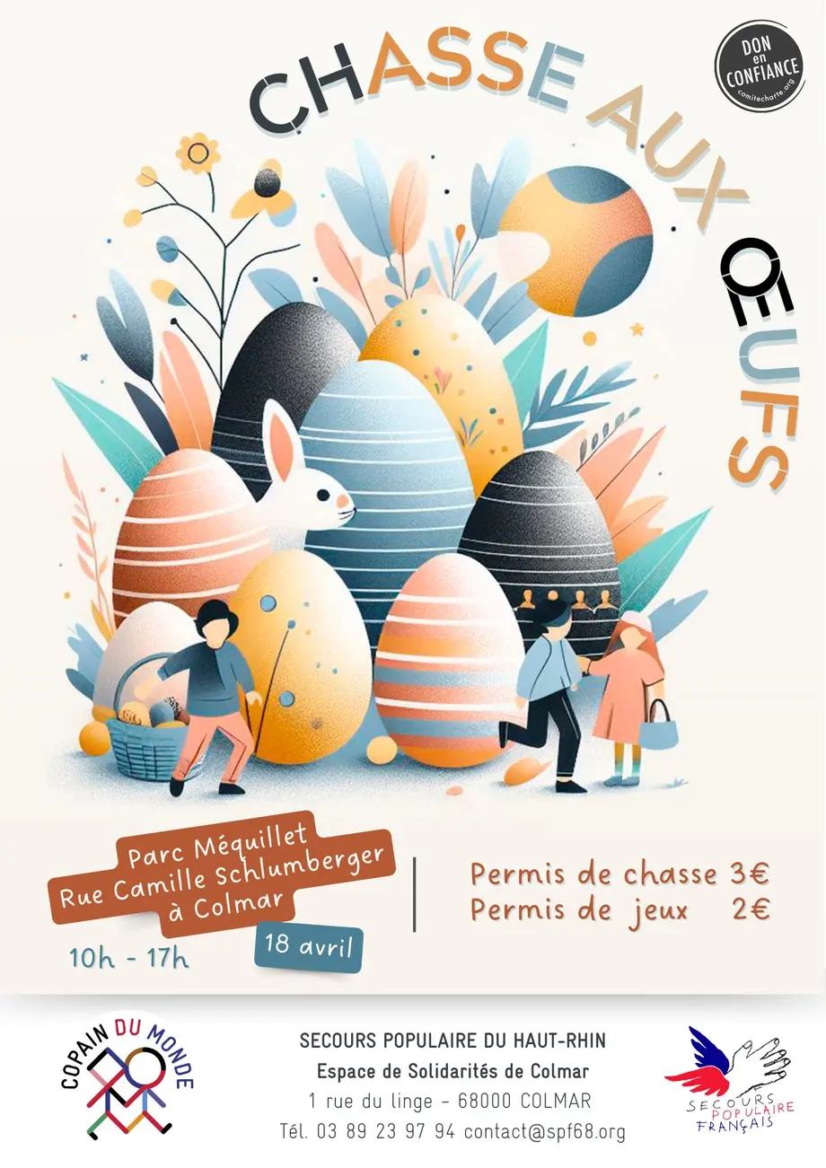 Les bénévoles du Secours populaire de Colmar vous invitent à leur incontournable chasse aux œufs, qui se déroulera le samedi 18 avril de 10h à 17h au parc Méquillet, situé rue Camille Schlumberger.