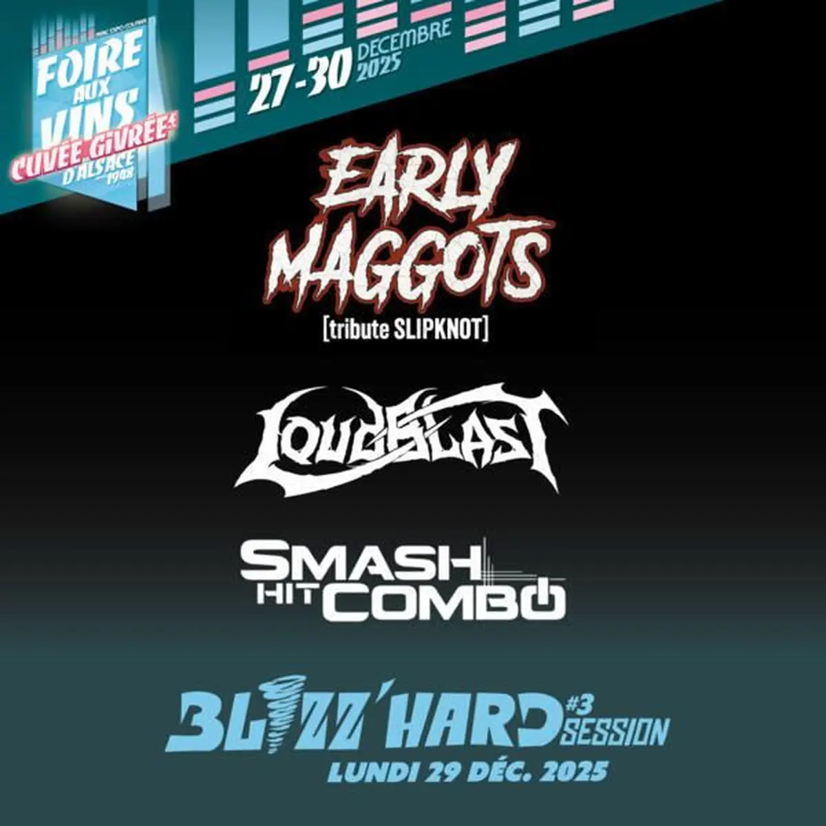 Les groupes qui seront sur la scène de la Blizz'hard#3 Session : Early Maggots (tribute Slipknot), Loudblast, Smash Hit Combo.
