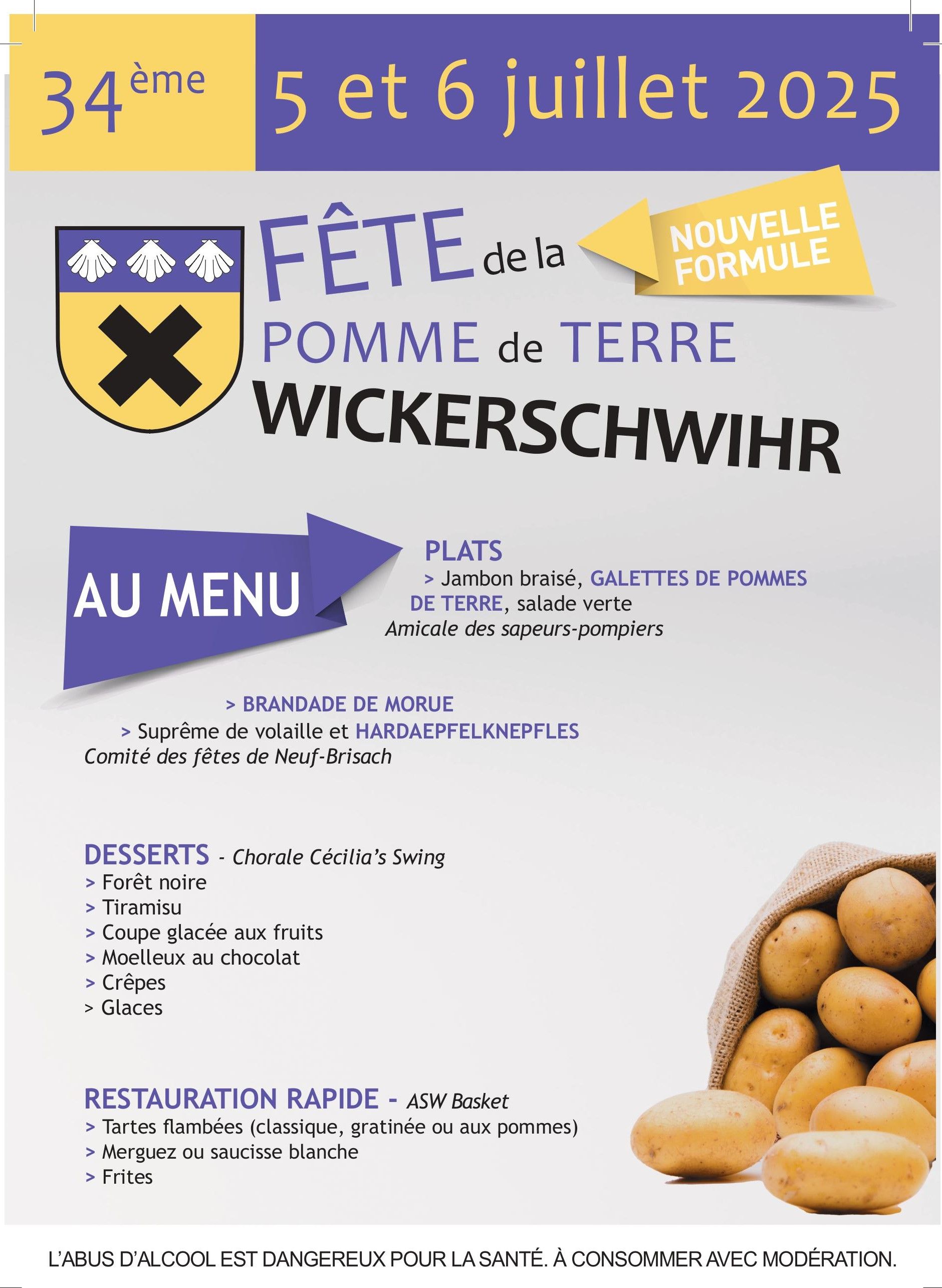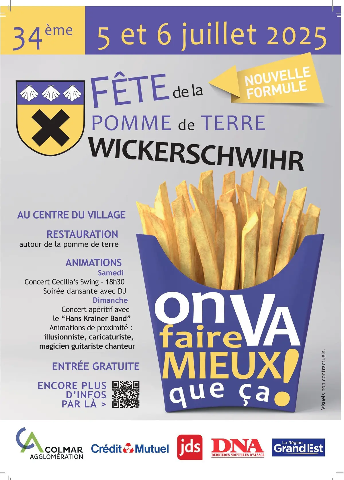 La Fête de la pomme de terre de Wickerschwihr, 34ème édition, est organisée les 5 et 6 juillet 2025. Une nouvelle formule, inaugurée en 2023, vous attend pour faire la fête et se régaler autour de la pomme de terre, sur la place de la mairie (en face de l’église).