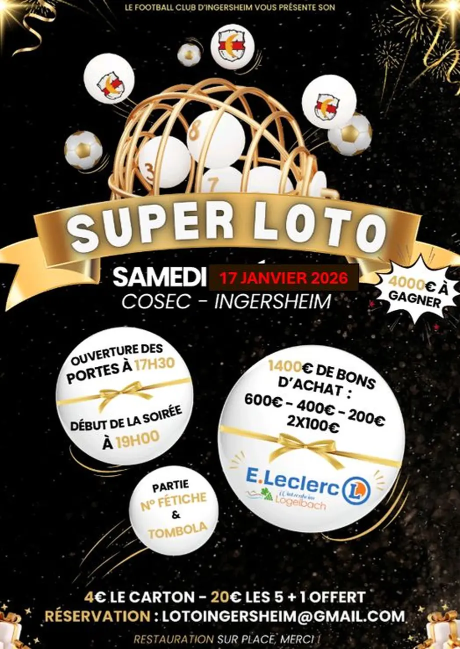 Suite au succès de sa précédente édition, le FC INGERSHEIM est heureux de vous convier à son second GRAND LOTO avec 4000 € de gains dont de nombreux bons d'achat LECLERC WINTZENHEIM-LOGELBACH. Ouverture des caisses à 17h30, petite restauration sur place.