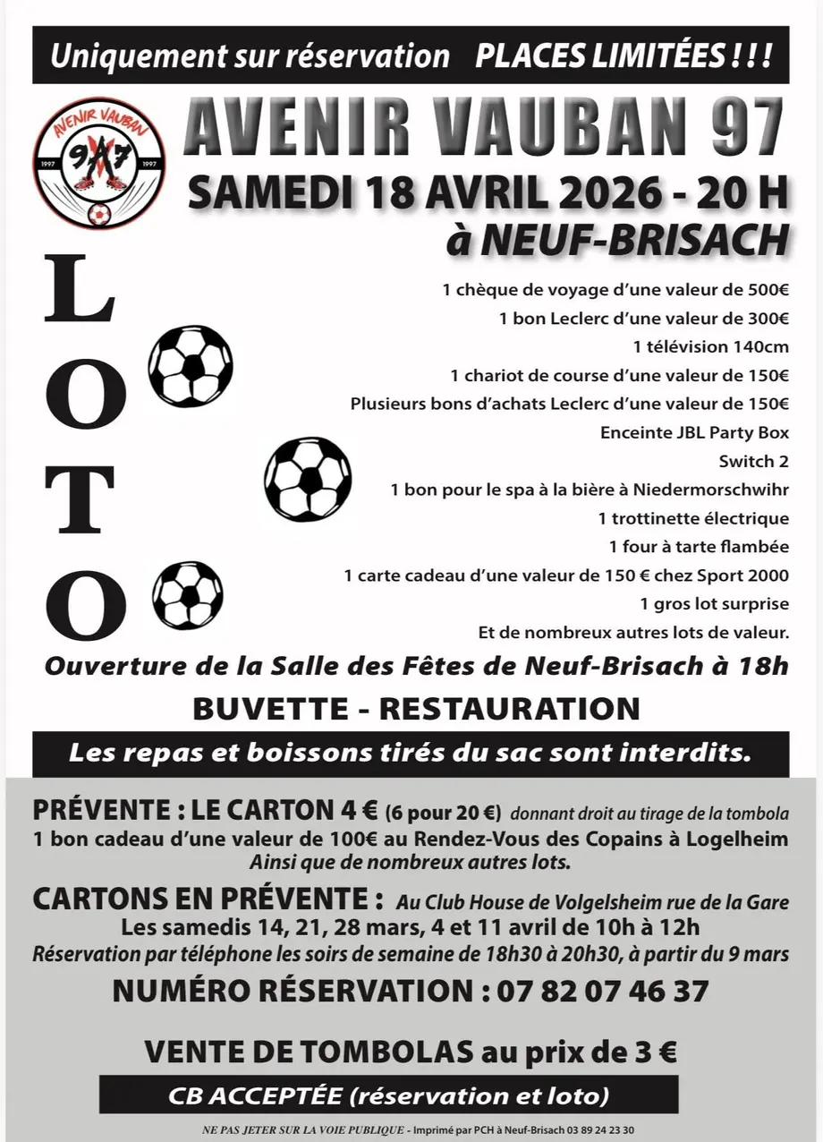 Cartons en prévente au Club House de Volgelsheim (rue de la Gare) aux dates indiquées sur le flyers.