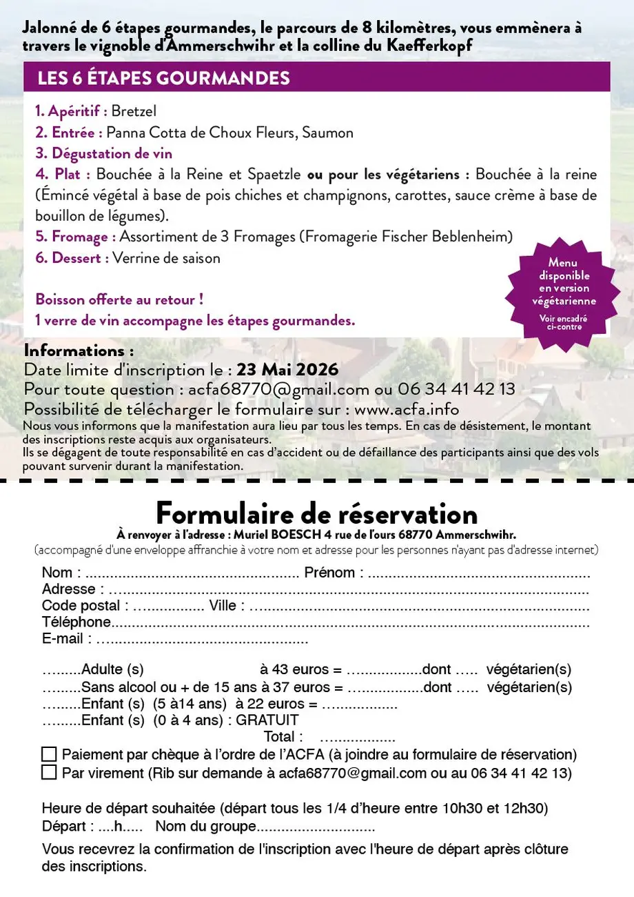 A travers le vignoble d’Ammerschwihr et la colline du Kaefferkopf nous vous proposons une marche gourmande sur un parcours de 8 kilomètres accessible à tous. Les chiens sont les bienvenues. La balade sera jalonnée par 6 étapes : apéritif, entrée, dégustation de vin, plat, fromage, dessert. Au retour une boisson vous sera offerte.