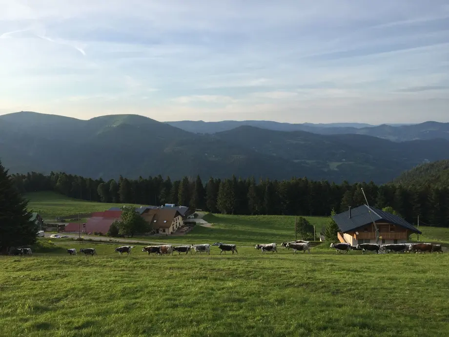 Marie-Ève et Yves se sont installés à la ferme en 1992, succédant aux parents d’Yves. Adrien, leurs fils et sa compagne, Alexia, après une formation agricole, ont rejoint l’exploitation fermière. Le domaine est composé de 145 ha de landes et de prairies d’altitude entre les pistes de ski du Schnepfenried et du Morfeld et de 100 ha de chaume. Le cheptel est composé de vingt quatre vaches laitières de race vosgienne, de dix vaches allaitantes de race charolaise, et d’une quarantaine de génisses.