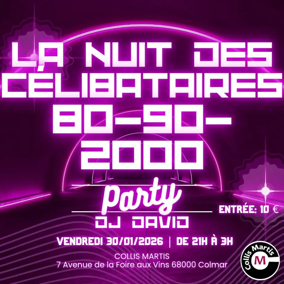 Le vendredi 30 janvier 2026, le Collis Martis à Colmar accueille La Nuit des Célibataires, une soirée festive dédiée à la rencontre et à la musique des années 80, 90 et 2000.