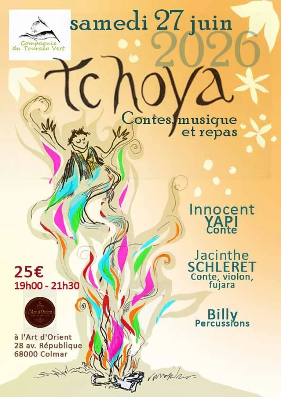 Depuis 2024, les soirées Tchoya de la Compagnie du Touraco Vert proposent une fois par mois des contes, de la musique et un repas oriental dans le magnifique salon de thé l’Art d’Orient à Colmar, chez Oum, au 28 avenue de la république. Les Tchoya sont une joyeuse émulation des cultures d’Afrique, d’Orient et d’Europe dans la bonne humeur et la détente. Ce sont des rencontres conviviales qui sentent bon le thé à la menthe, au cours desquelles Innocent Yapi fait vivre des poèmes, des proverbes ainsi que les 103 contes ( de tous les continents) de sa calebasse à histoires. Et pour que la fêtes soit encore plus belle, d’autres artistes complices, conteurs et musiciens sont conviés à partager la scène avec lui.