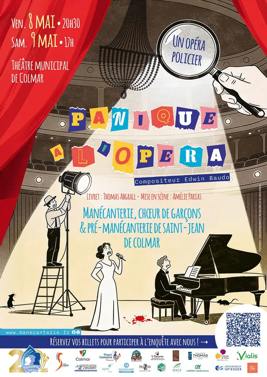 Panique à l'Opéra est une oeuvre originale qui fusionne les univers de l'opéra et du polar pour offrir une expérience immersive et interactive. À travers une intrigue mystérieuse, remplie d'humour et de poésie, l'opéra invite le public, jeunes et adultes, à plonger dans les coulisses d'un théâtre, où les mystères et les rebondissements se succèdent, tout en mettant en lumière les métiers du spectacle.