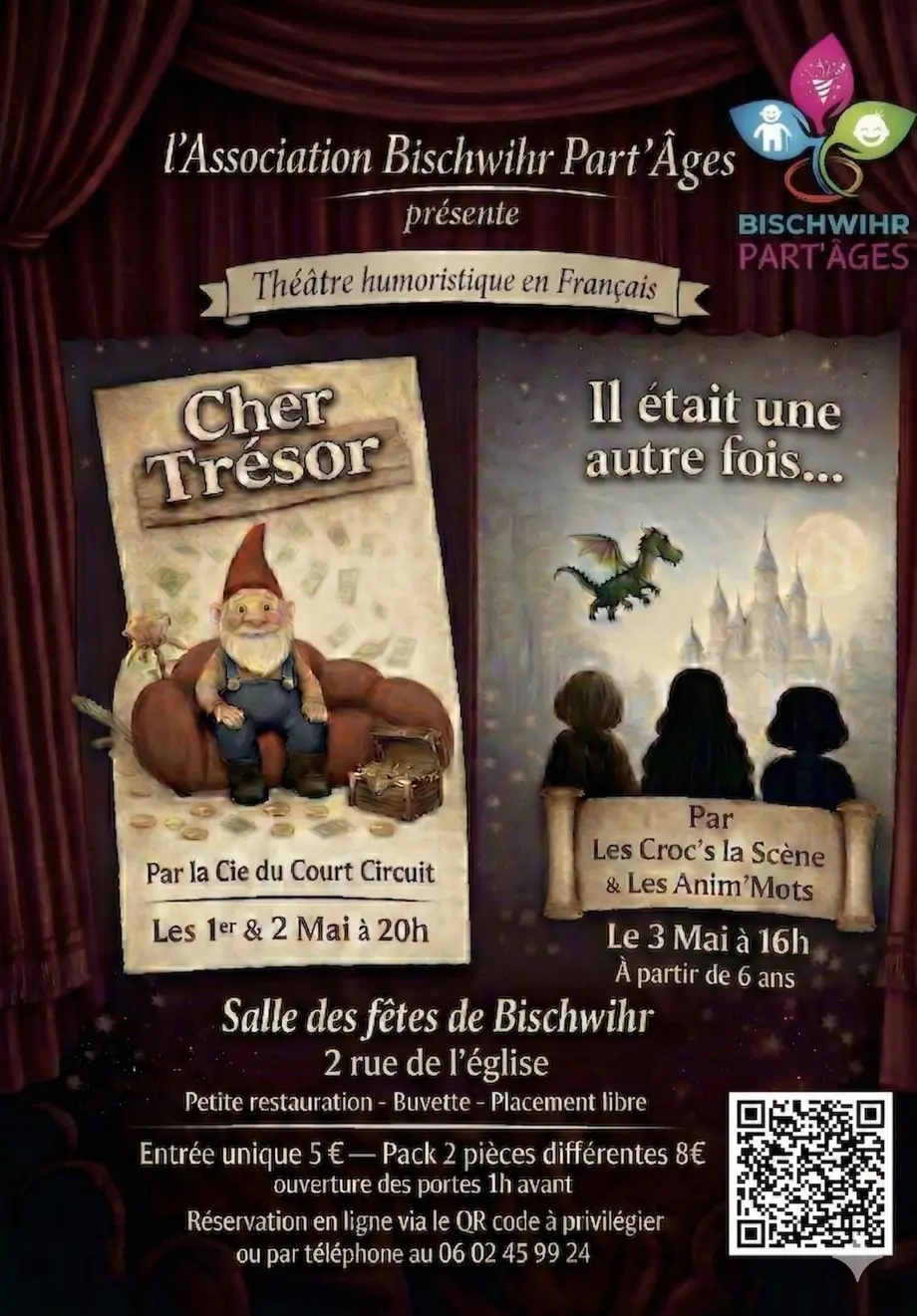 L'association Bischwihr Part’Âges vous invite à la Salle des Fêtes pour un week-end placé sous le signe de l'humour et de la féerie. Découvrez deux pièces pour petits et grands :