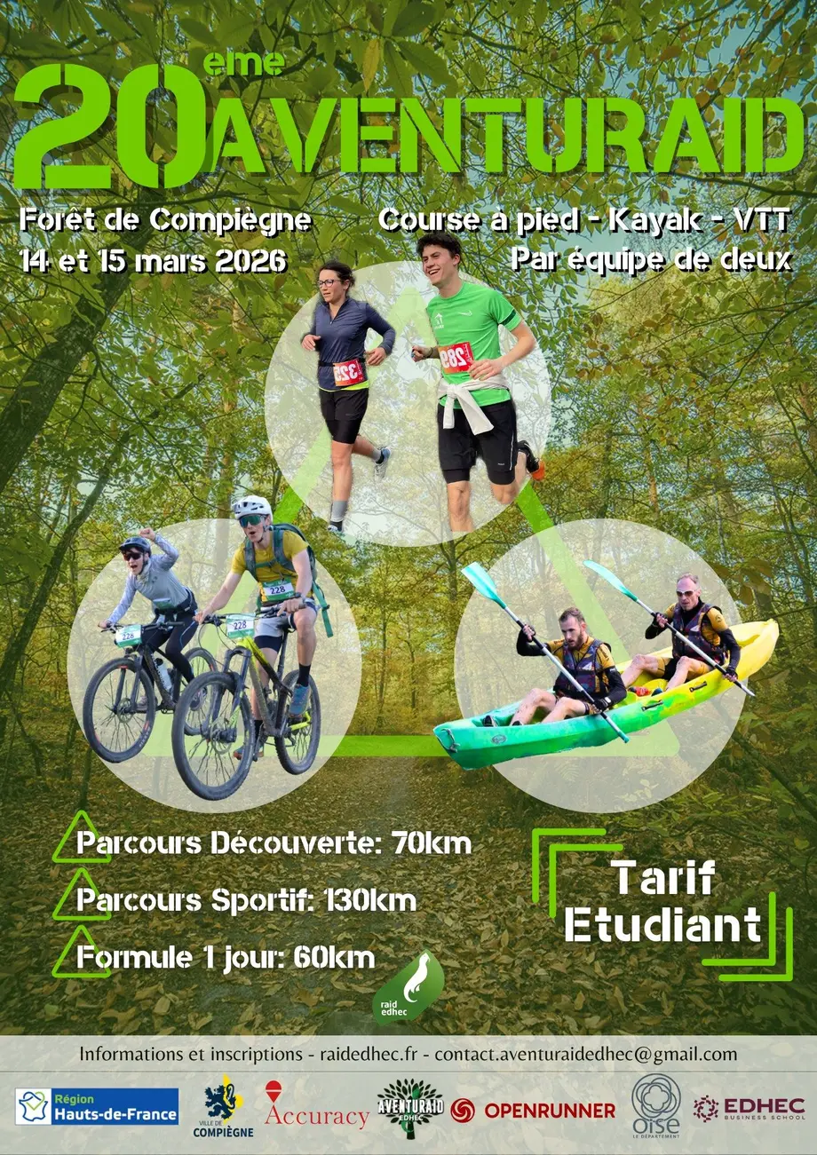 L’Aventuraid EDHEC revient pour sa 20ème édition le week-end du 14-15 mars 2026 dans la forêt de Compiègne ! N’hésitez plus, l’Aventuraid est accessible à tous : que vous soyez sportifs ou que vous cherchez à vous dépasser, vous avez le choix entre parcours découverte et sportif.