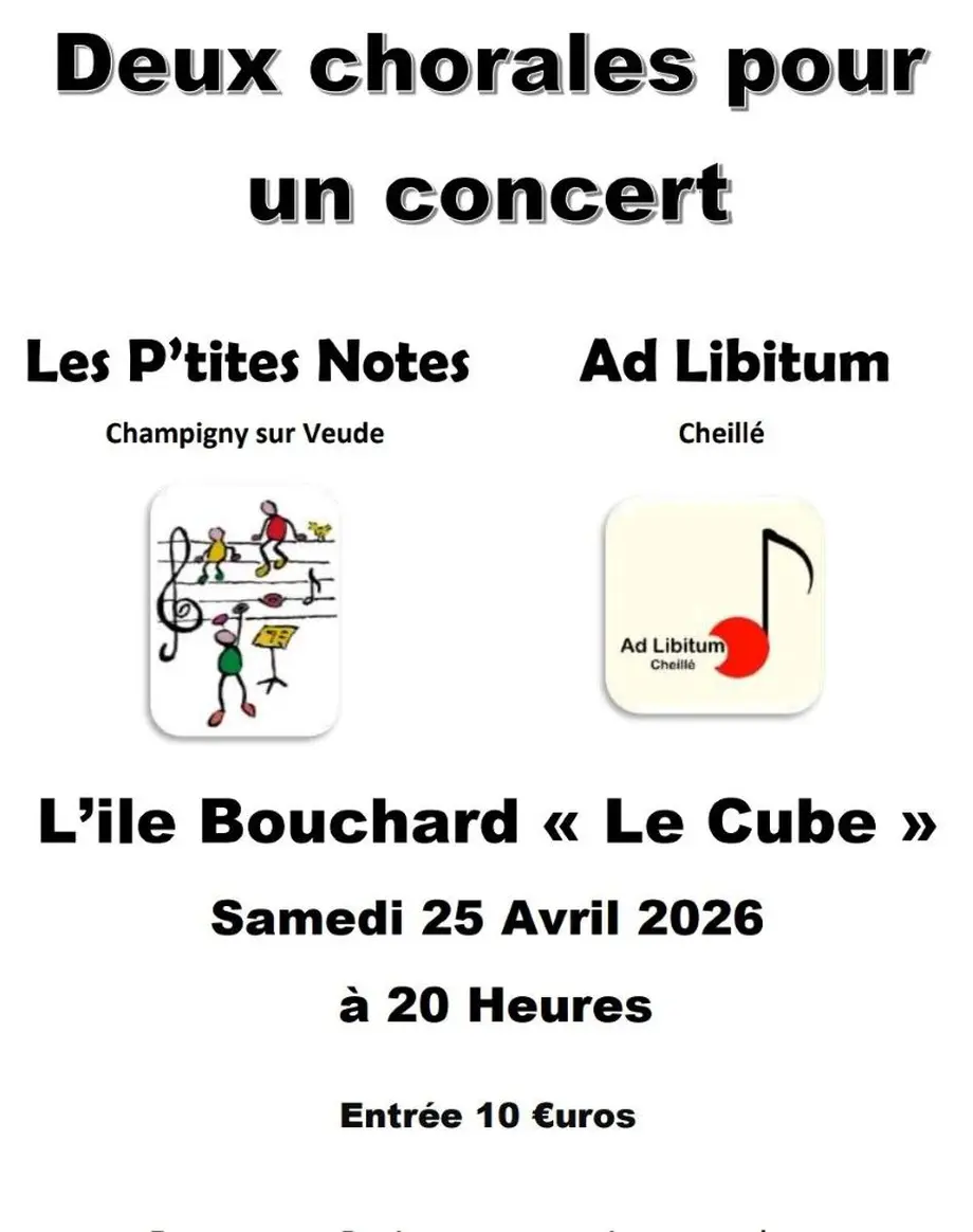 Les chorales « Les P’tites Notes » de Champigny-sur-Veude (chants contemporains et chants du monde) et « Ad Libitum » (ensemble vocal et instrumental) s’uniront pour ce concert « Deux chorales pour un concert ».