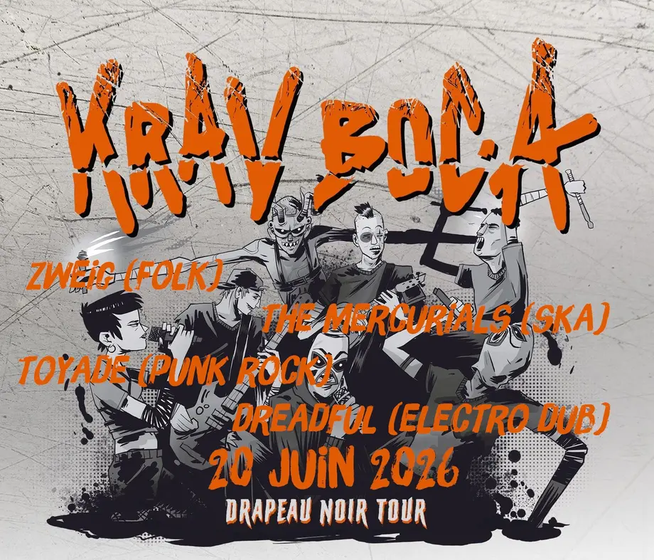 Le show de la troupe Krav Boca sonne comme le récit d’une aventure unique, rassemblant un public fidèle aux quatre coins de l’Europe. Un rituel punk prenant vie sous les mots de rappeurs masqués, porté par un trio guitare-batterie-mandoline et les acrobaties d’une voltigeuse aérienne. Un live inclusif sous forme de transe collective où les spectateurs deviennent acteurs.