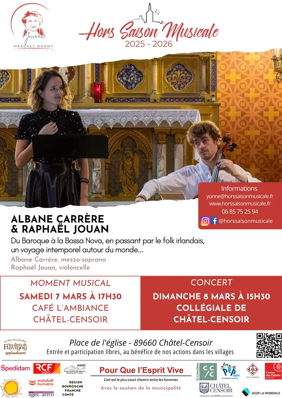 Hors Saison Musicale vous invite au concert du duo de Albane CARRER (mezzo-soprano) et Raphaël JOUAN (violoncelle) à l'église Chatel-Censoir (89) le 8 Mars 2026.