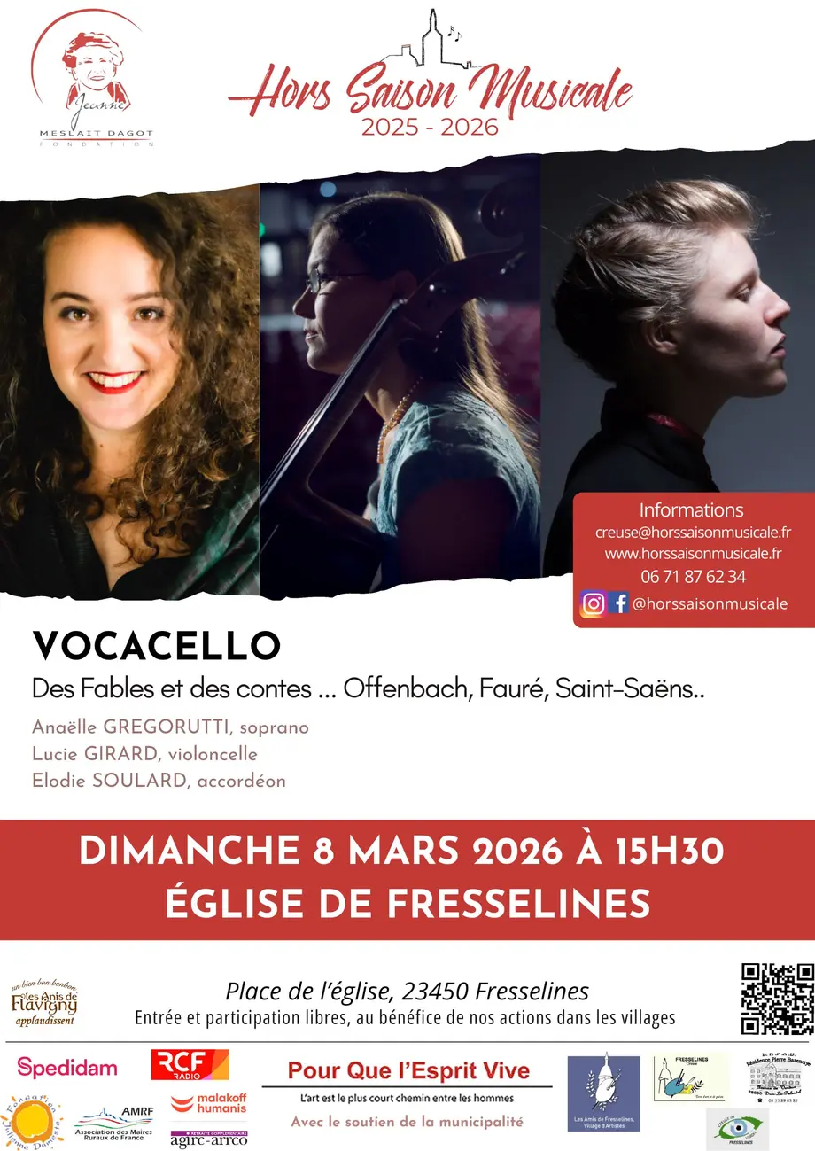 Hors Saison Musicale vous invite au concert du trio Vocacello à l'église de Fresselines (23) le dimanche 8 Mars 2026.