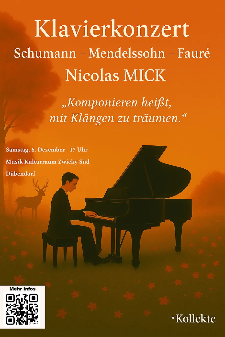 Der Pianist Nicolas Mick lädt zu einer musikalischen Reise zwischen Frankreich und Deutschland ein, bei der er die romantische Leidenschaft Schumanns, die Leuchtkraft Mendelssohns und die verträumte Sanftheit Faurés miteinander verbindet. Der an den größten europäischen Konservatorien ausgebildete Künstler zeichnet sich durch sein sensibles, präzises und tief empfundenes Spiel aus.