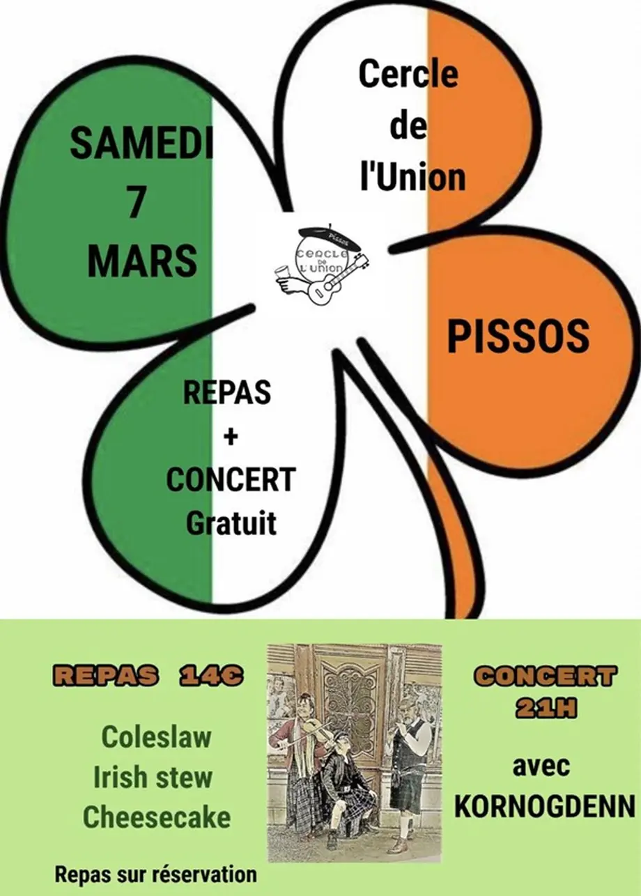 Soirée irlandaise organisée par le Cercle de l'Union, le samedi 7 mars 2026, avec repas et concert.