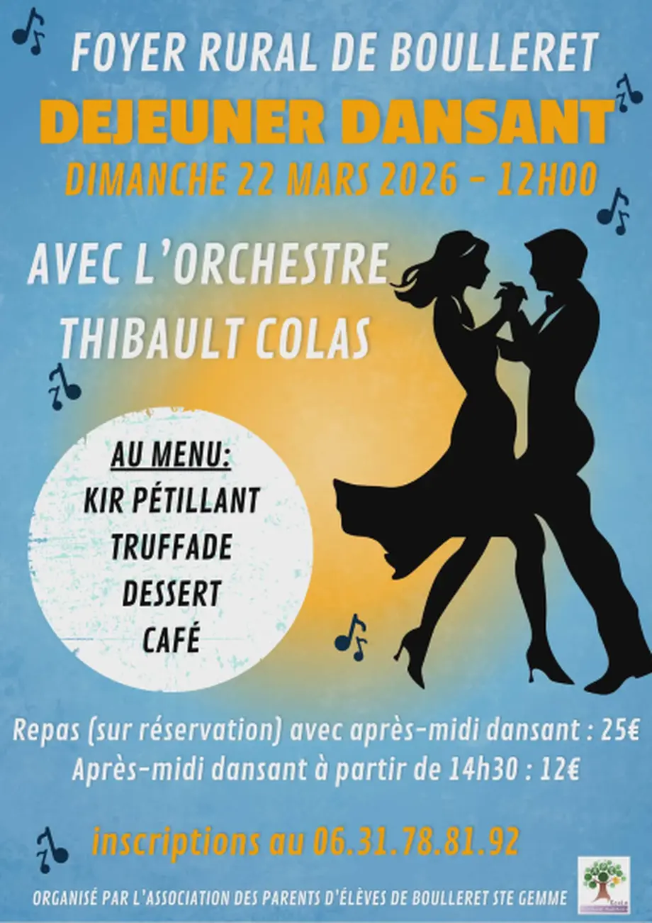 Vous avez le choix entre l’après-midi dansant, à partir de 14 h 30, avec l’orchestre de Thibault Colas, ou le déjeuner et la danse sur les musiques de Thibault Colas.