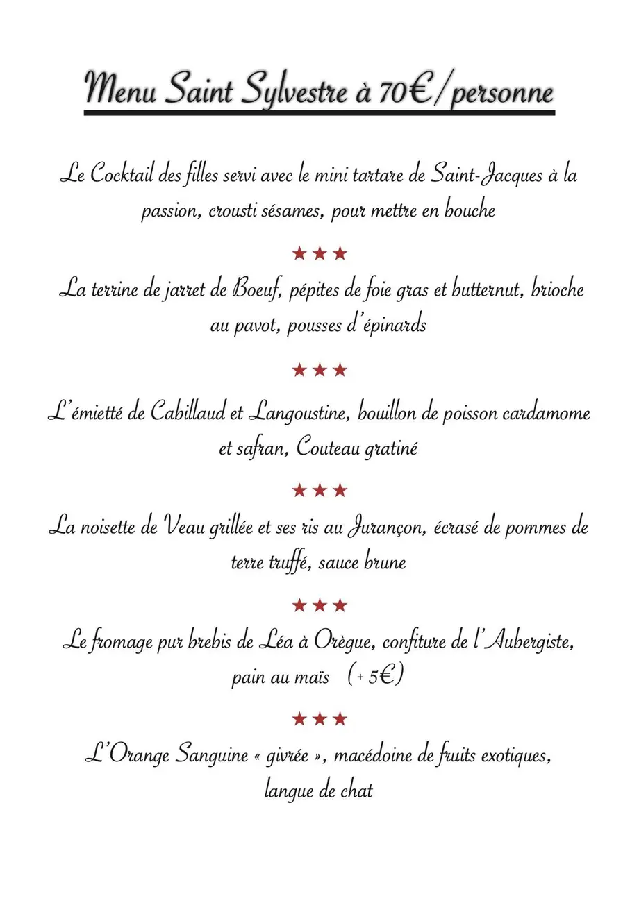 Menu des fêtes L'Auberge du Pas de Vent (Soir)