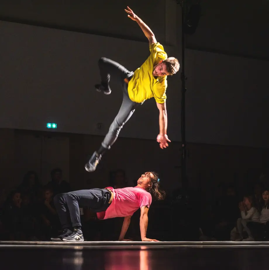 Dans un espace de jeu restreint, deux acrobates cherchent des solutions pour parvenir à l’harmonie. Les corps se rencontrent et s’entremêlent… Porteur et voltigeur se confondent et se confrontent avec complicité et humour.