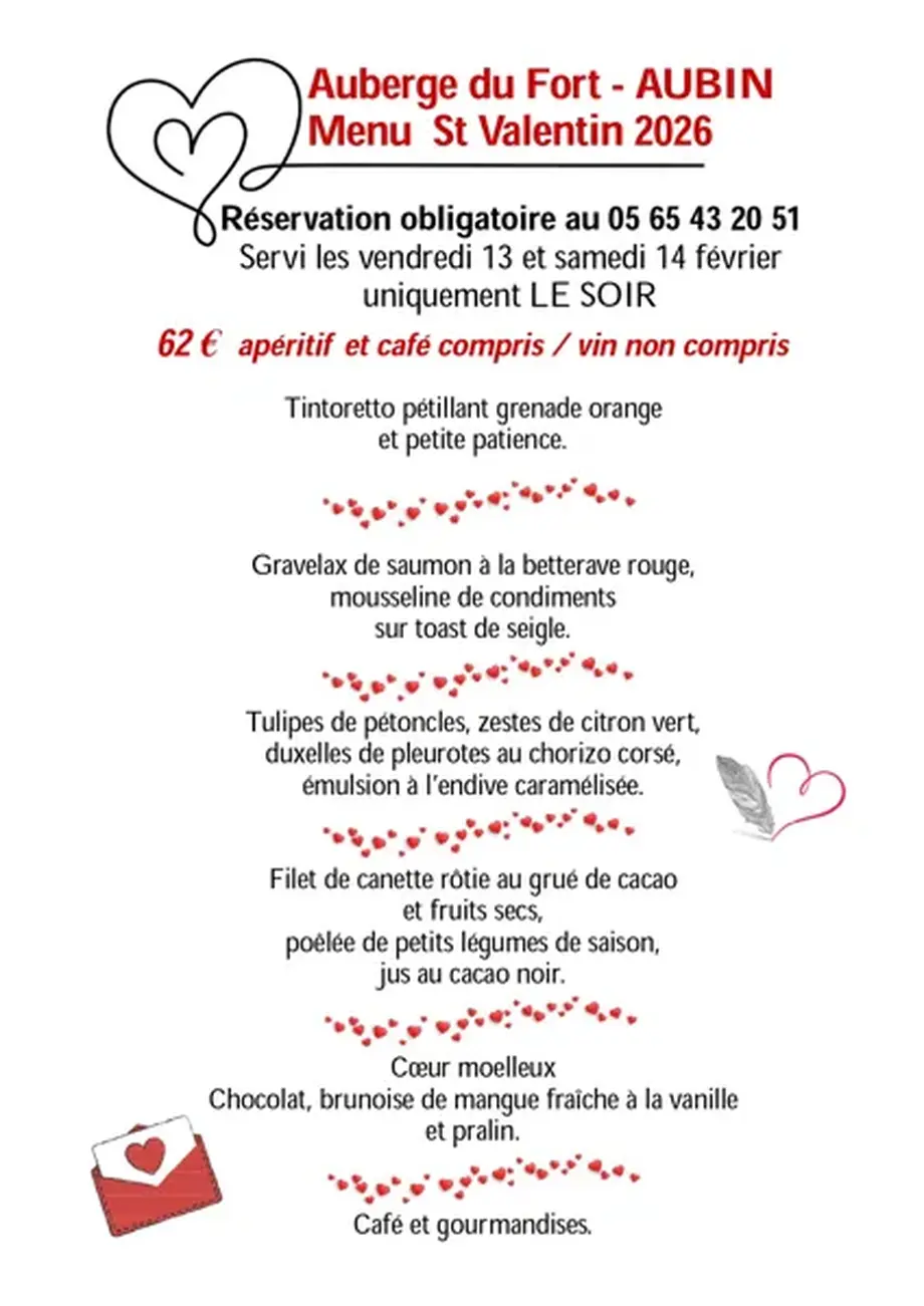 Dîner de la St Valentin au GrizouLe 14/02/2026 AubinÀ partir de 19 h 30 au Grizou, menu à 28 € :