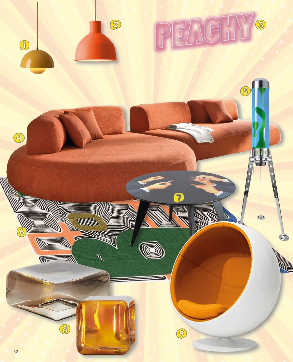 Plongez dans l'originalité et la folie des années 70, de la culture pop célébrant les couleurs et les motifs improbables. Ode au design, aux formes et aux tons électrisants pour vous créer un intérieur décalé et irradiant. - Alix S