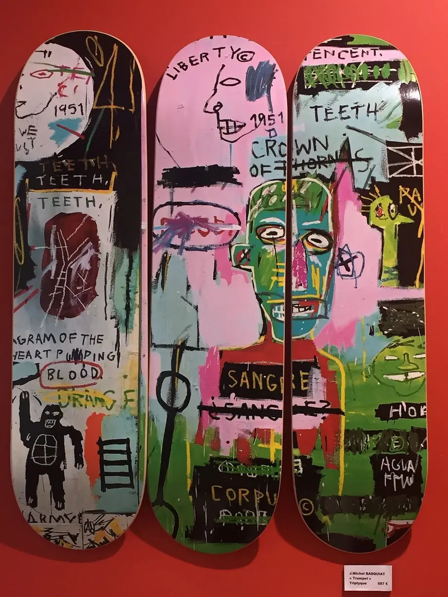 Skateboards d’art, The Skateroom et Jean-Michel Basquiat, disponibles à la Galerie Courant d’Art, 10 rue des Tanneurs à Mulhouse