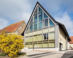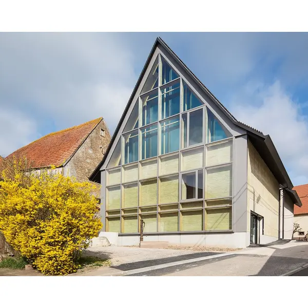 Les espaces d'accueil et d'expositions ont pris place au coeur de la commune de Dehlingen dans un bâtiment BBC qui fait dialoguer un logis du 17e siècle et une extension contemporaine en pisé, technique millénaire de construction en terre.