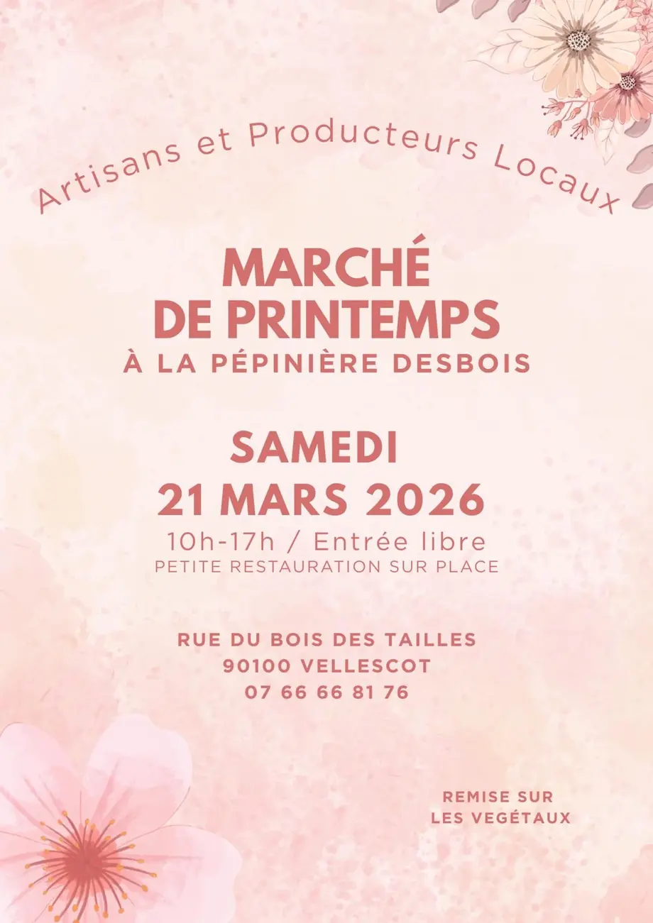 Venez assister au 3e marché de Printemps organisé a la pépinière Desbois de Vellescot, regroupant des artisans locaux axés recyclage, zéro déchets, nature et Cie mais aussi des producteurs locaux.