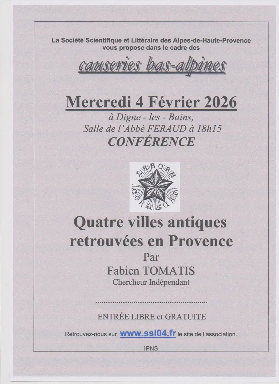 Fabien Tomatis nous présentera ses découvertes : 3 villes gauloises et un port grec antique .Il se propose de dégager de dégager de ces cas quelques conclusions sur l'étude des textes , l'urbanisme antique , la conquête romaine , et les apports de la toponymie .