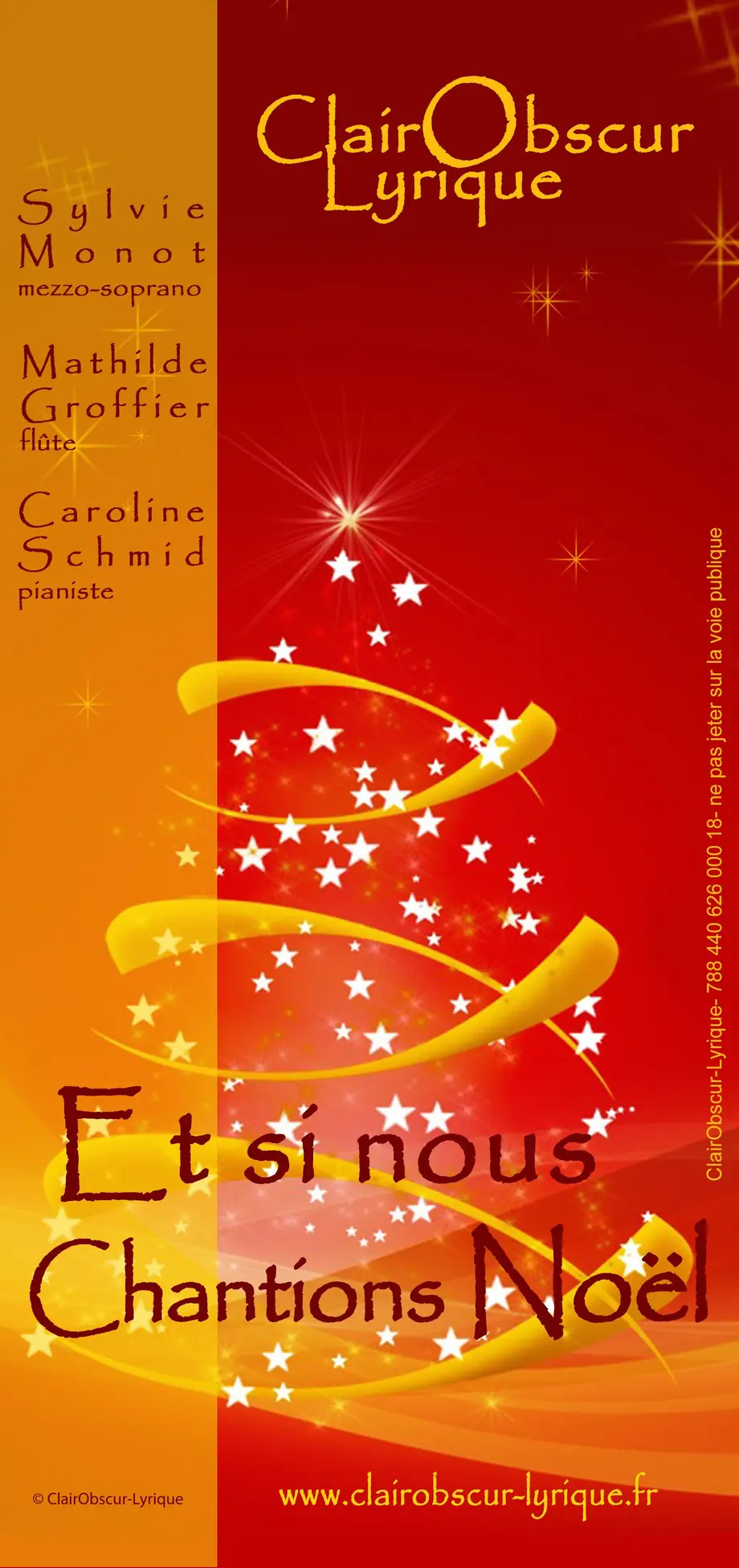 Dans le cadre de la programmation de Noël à Dijon, ClairObscur-Lyrique présente un concert lyrique flûte-chant-piano-conte " Si nous chantions Noël ", avec Sylvie Monot soliste lyrique mezzo-soprano, Caroline Schmid pianiste, Mathilde Groffier autour d’un florilège de pièces vocales et instrumentales issues du répertoire de musique sacrée et de traditionnels de Noël.