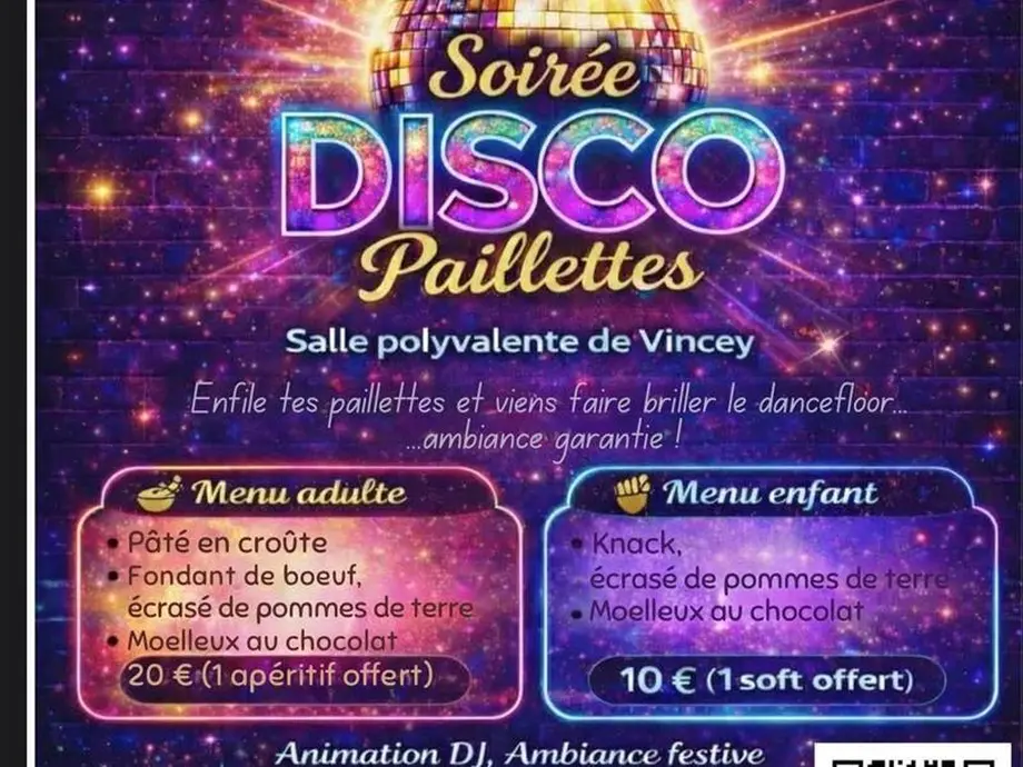 L'AAEL vous propose, le samedi 25 avril 2026 à partir de 19 h, à la salle polyvalente de Vincey, une soirée dansante sur le thème « disco et paillettes ».