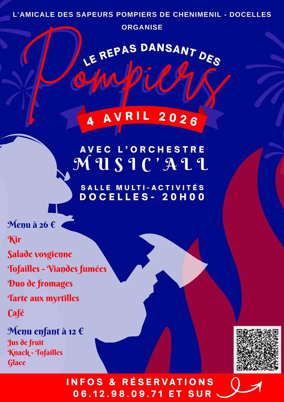 L'amicale des Pompiers de Chenimenil Docelles organise un repas dansant le Samedi 4 Avril a la salle multi activités de Docelles animée par l'orchestre Music'All. Menu Vosgien au tarif de 26€ par adulte et 12€ par enfant. Info et Réservation au 06 12 98 09 71 où sur Hello asso.
