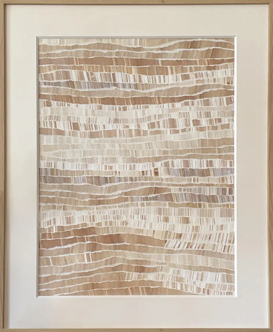 Ses collages monochromes sont réalisés à partir de papiers qu’elle peint elle-même, puis déchire et compose. C’est un travail élégant et sensible autour des déchirures qu’elle laisse apparentes et qui, par leurs lignes organiques, donnent naissance à des compositions tantôt abstraites, tantôt figuratives. Ses trames, comme des tissages, peuvent évoquer des éléments naturels comme l’écorce, les forêts, la mer ou la montagne.