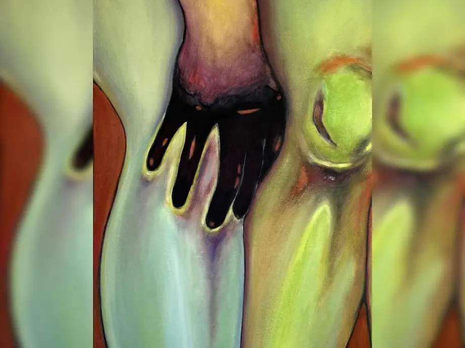 Shuyin Hou observe les lichens et peint nos corps humains. Les structures ligneuses et agglutinées des lichens influencent ses peintures, tout comme leurs équilibres complexes : les symbioses entre algues et champignons prennent parfois la tournure de relations de dépendance et d’exploitation plus « toxiques ».