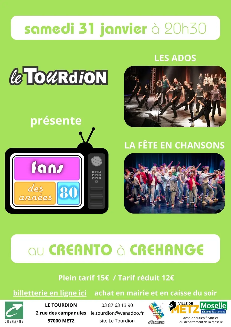 Le groupe des adultes présentera son spectacle «Fans des années 80». La trame ? Une soirée télé de l’époque, avec sa speakerine, ses coupures pubs, ses jingles et son émission de variété ! Le tout rempli de hits du moment, connus de tous (Goldman, Lio, Gold, Gilbert Montagné), francophones, en version polyphonique, mis en scène et en mouvements dans un style des années 80 : de la couleur, du peps, des sourires flamboyants et les costumes qui vont avec ! Un petit plus : ce sera un spectacle interactif ! Le public sera invité à participer à différents moments du spectacle…