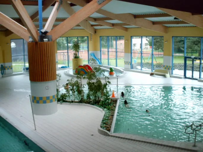 Cette piscine est dotée de deux bassins intérieurs de 25 x 10 m et de 12 x 10 m. Le petit bassin est équipé d'un bain à bulles et d'une pataugeoire.