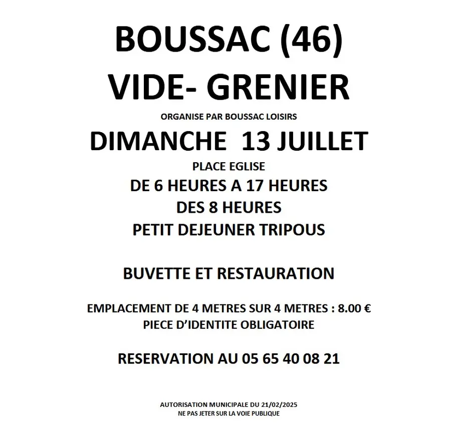 L’association Boussac Loisirs organise la 20e édition de son vide-grenier estival.