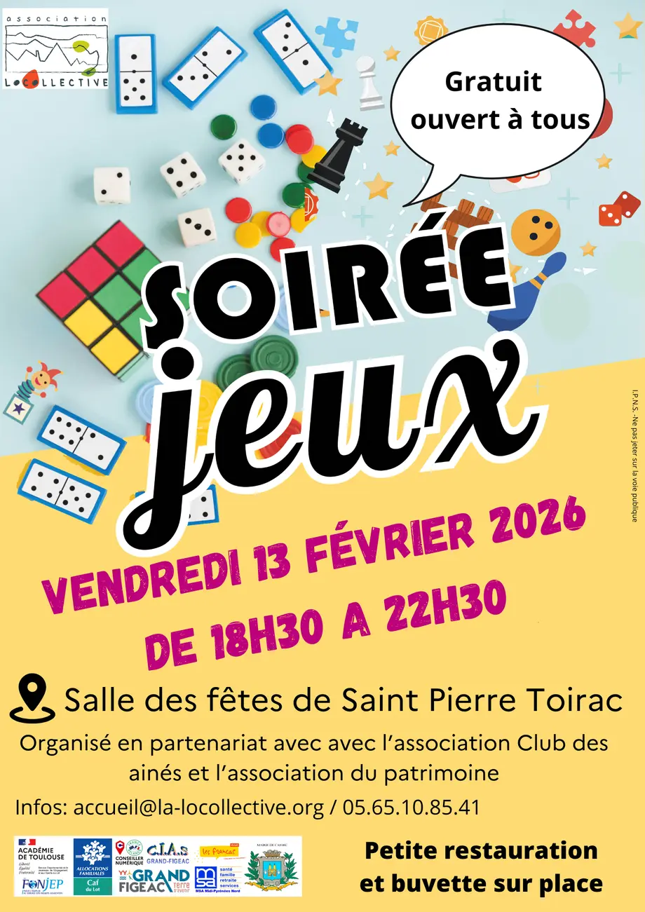 Les associations La LoCollective et le Club des aînés et du patrimoine de Saint-Pierre-Toirac vous donnent rendez-vous à partir de 18 h 30 à la salle des fêtes de Saint-Pierre-Toirac pour une soirée de jeux en tous genres, pour tous les goûts et pour tous les âges.