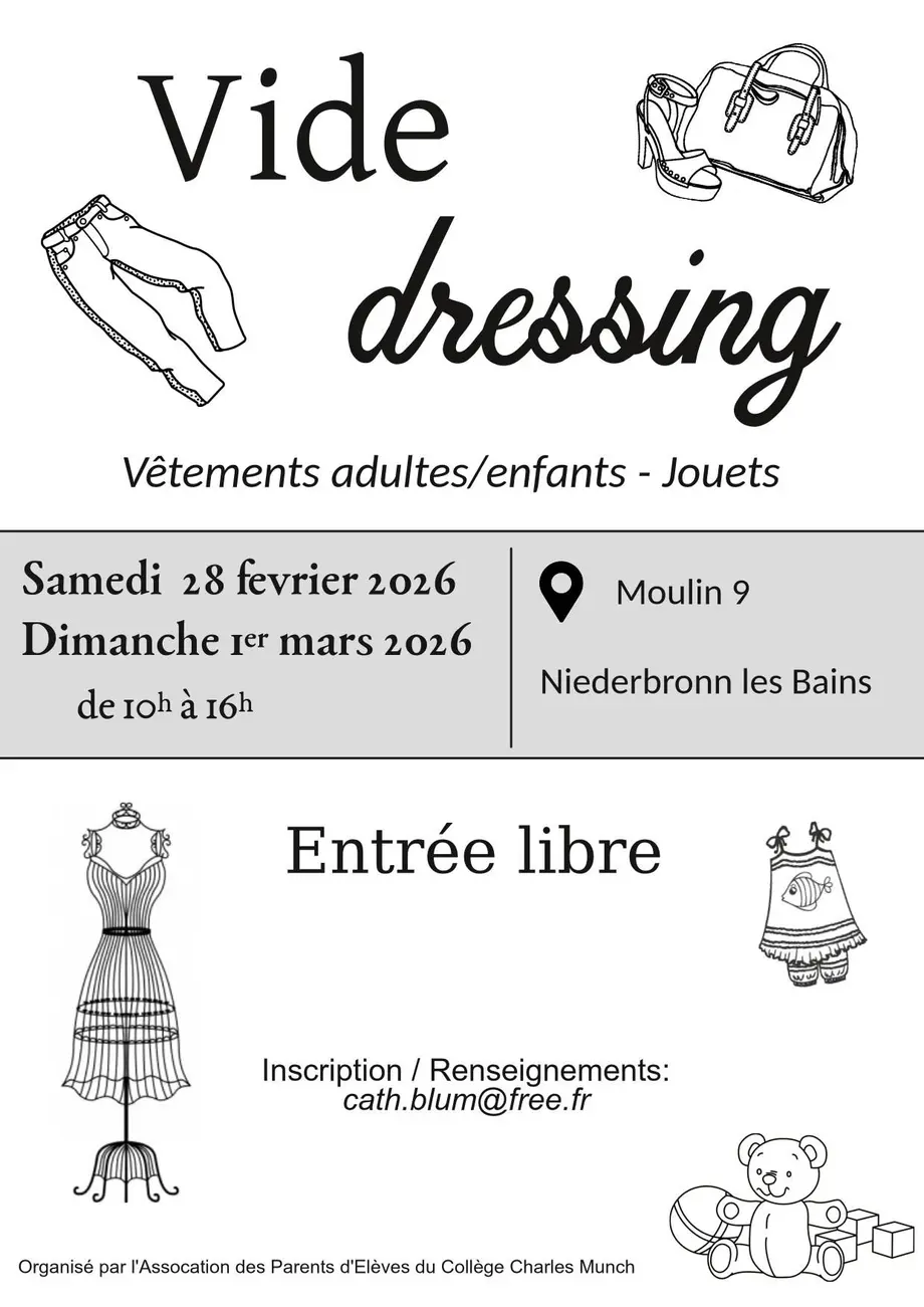 L'association de parents d'élèves du Collège Charles Munch de Niederbronn-les-Bains organise un Vide dressing vêtements adultes/enfants et jouets le 28 février et 1er mars de 10h à 16h au Moulin 9 – Niederbronn-les-Bains.