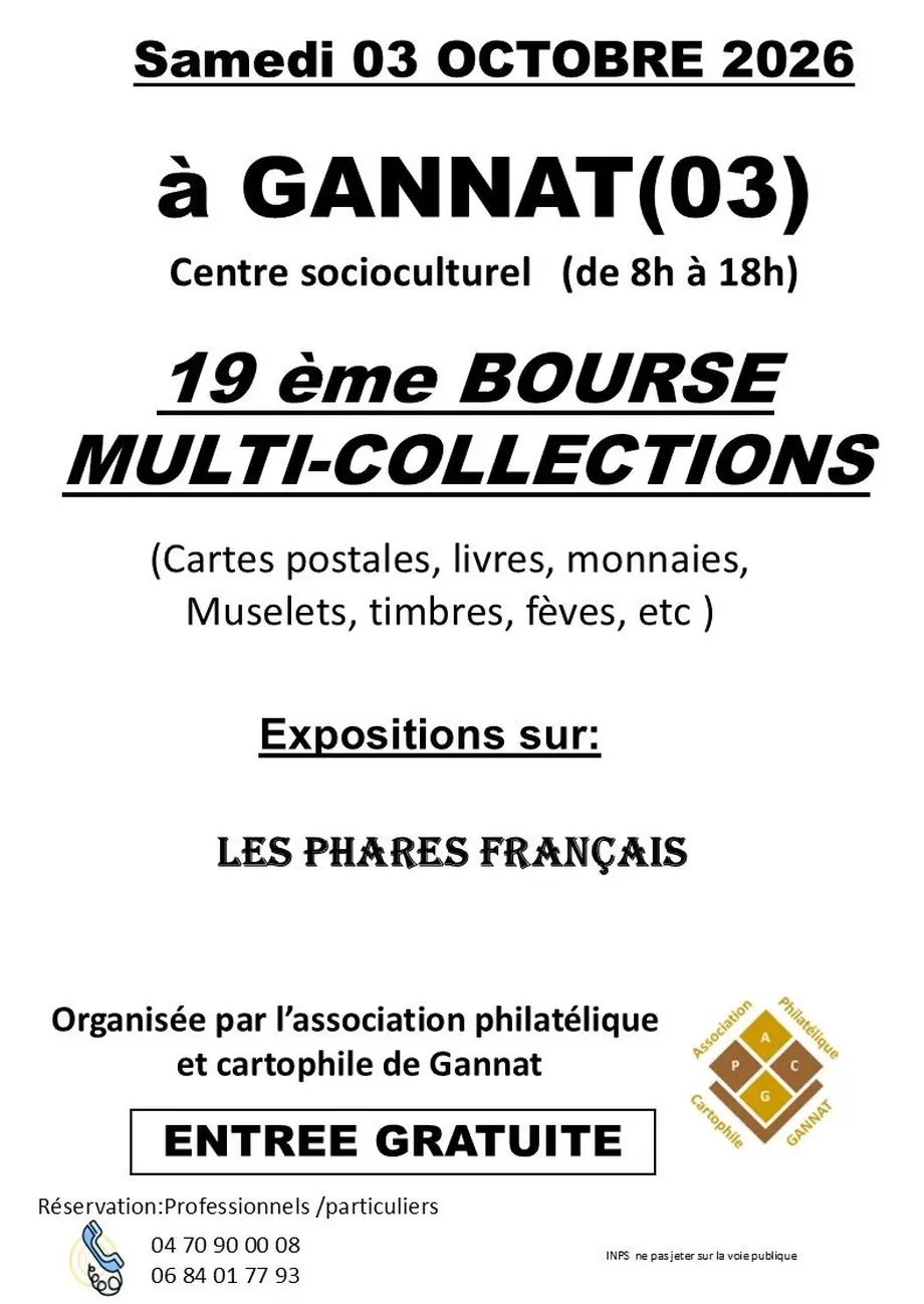 l'association philatélique et cartophile de Gannat organise sa 19éme bourse multi collections (timbres, cartes postales, vieux papiers, livres; muselets; monnaies, fèves, pins ect) au centre socioculturel de GANNAT le 03 octobre 2026 de 8h00 à 18h00.