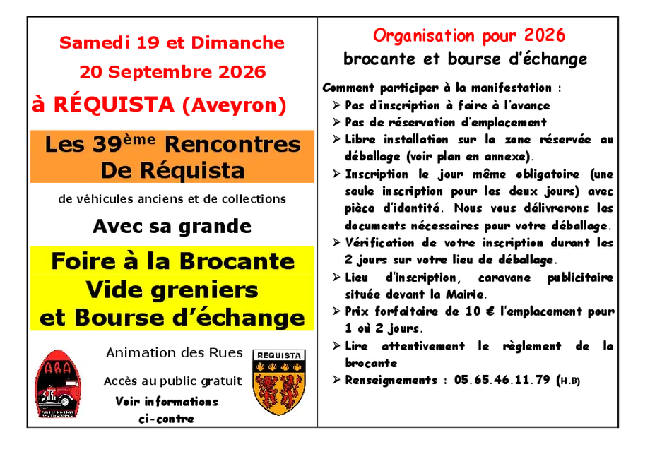 39eme édition Foire à la Brocante - Vide Grenier - Bourse d'Echange et Rencontres de Réquista de véhicules anciens et de collections