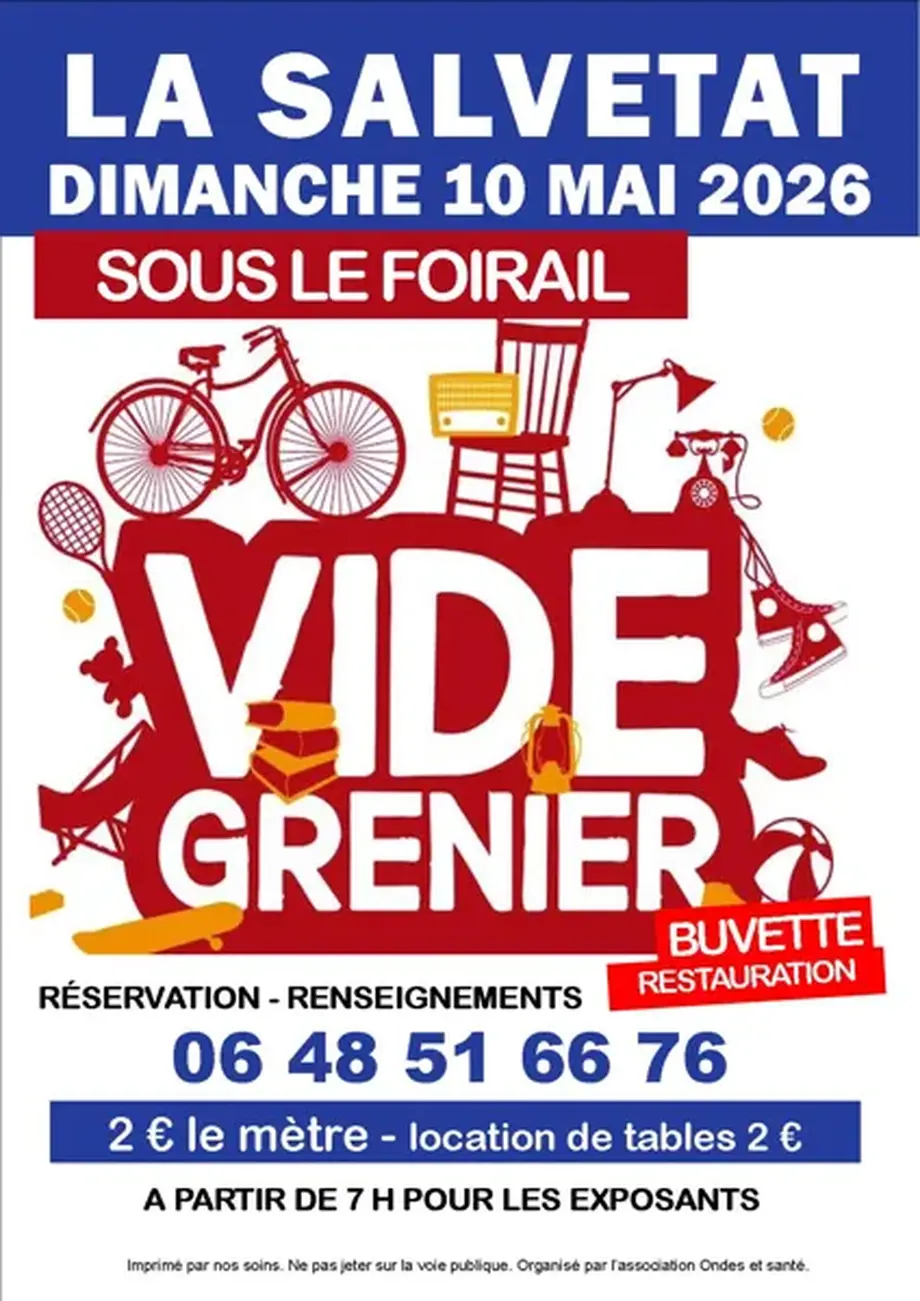 Vide-greniersLe 08/05/2026FoissacPour réserver un emplacement, inscription avant le 30 avril au 06 25 10 37 57 ou à foissac.rencontre@gmail.com.
