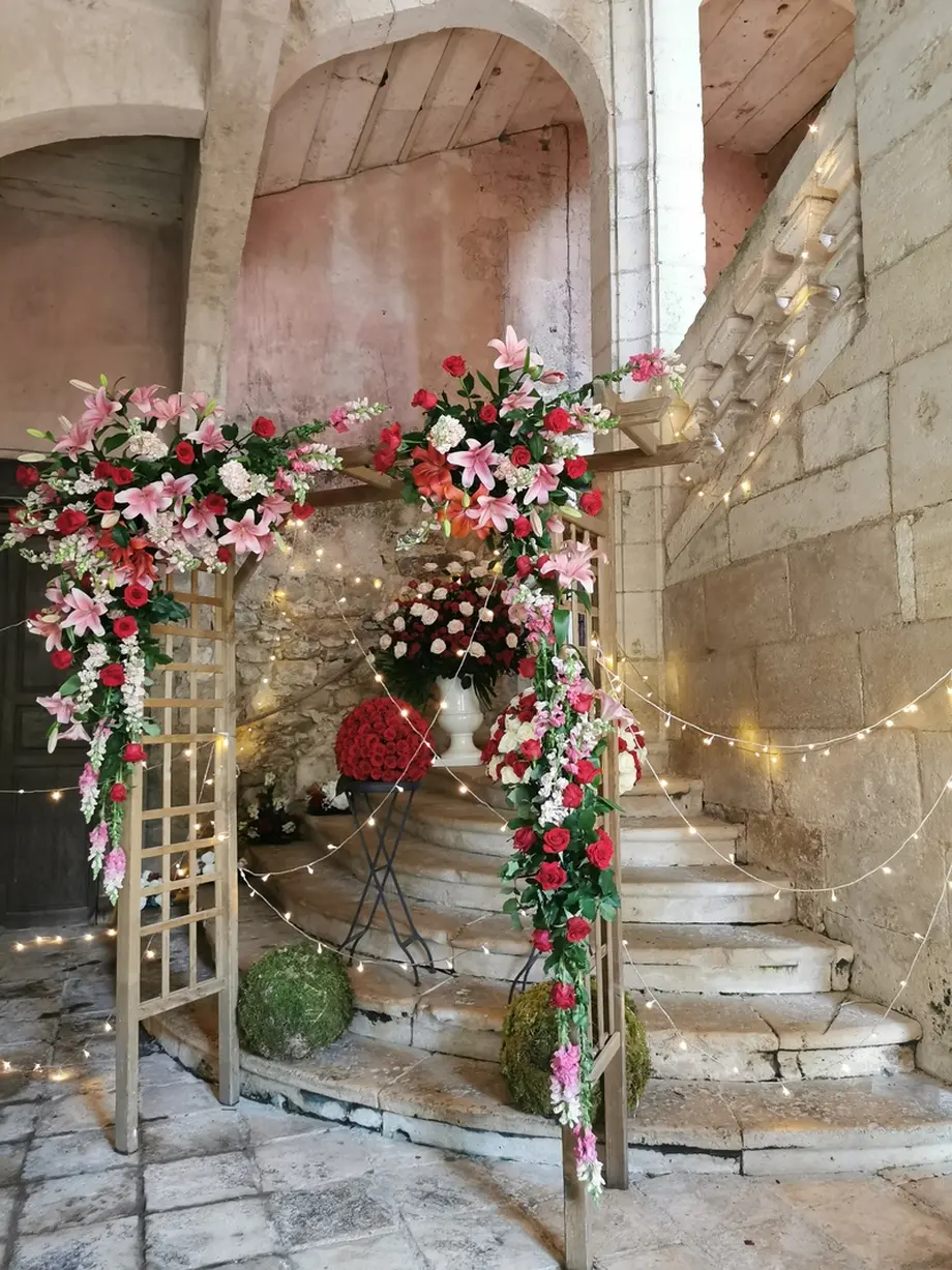 Les salles voûtées du château de la Marthonie, ainsi que l'église du XIIe siècle, sont fleuries.