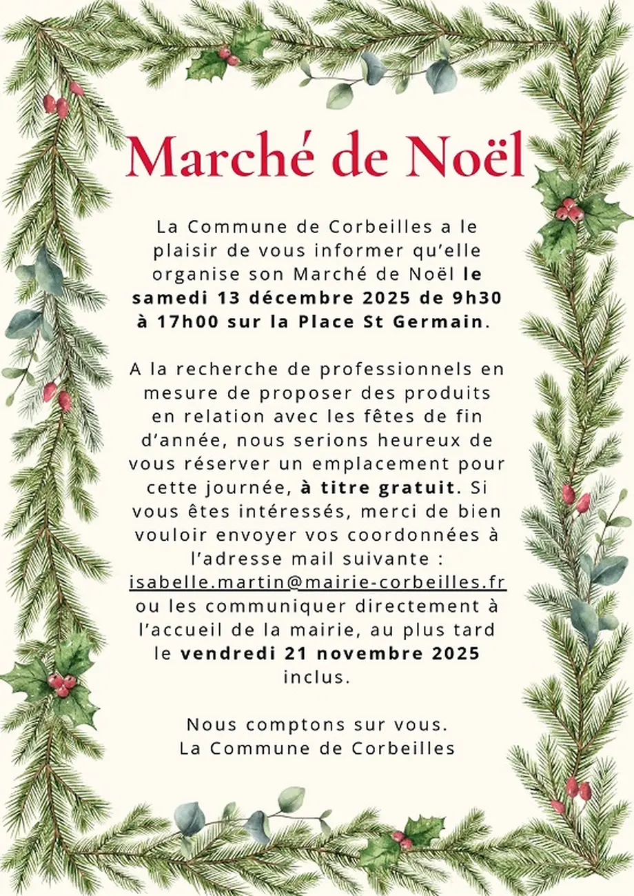 N'hésitez pas à vous inscrire le plus tôt possible à l'adresse isabelle.martin@mairie-corbeilles.fr, au plus tard le 21 novembre.