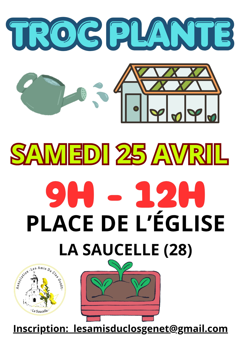 Troc' PlantesLe 03/05/2026Cloyes-les-Trois-RivièresTroc'plantes organisé par l'Amicale de Saint-Hilaire-sur-Yerre.