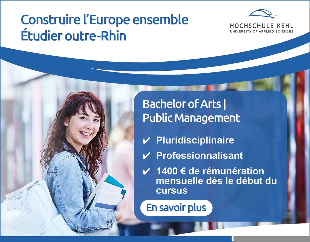 Tu souhaites étudier à deux pas de la frontière et perfectionner ton allemand ? Tu envisages une carrière dans l’administration publique ? Tu souhaites être rémunéré durant tes études ? Le Bachelor Public Management de la Hochschule Kehl est pour toi !