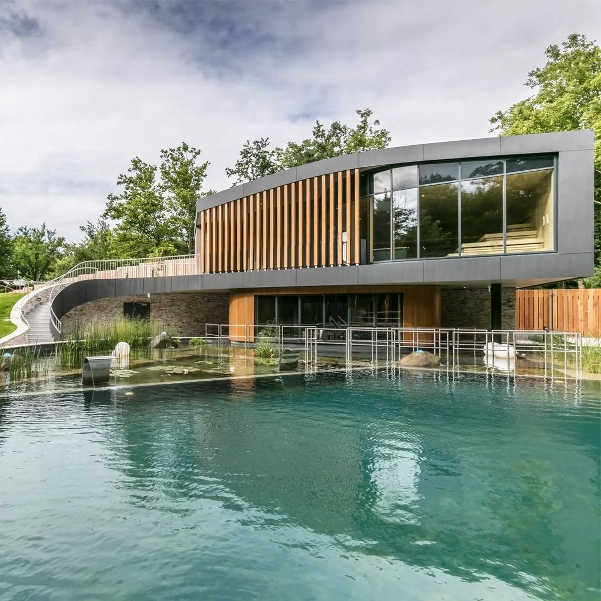 Ces thermes s'étendent sur 6000 m² dédiés à la détente et au bien-être. Ils sont composés de huit bassins d'eau thermale minérale, intérieurs ou extérieurs, de 9 saunas et d'un hammam. L'espace sauna est un havre de paix : offrant un espace intérieur cosy et des bâtiments extérieurs tout en bois, articulés autour d'un petit lac naturel (où vous pourrez vous rafraîchir) offrant des vues depuis pratiquement tous les saunas. Le lieu est propice à la relaxation et au bien-être pour toute la famille.