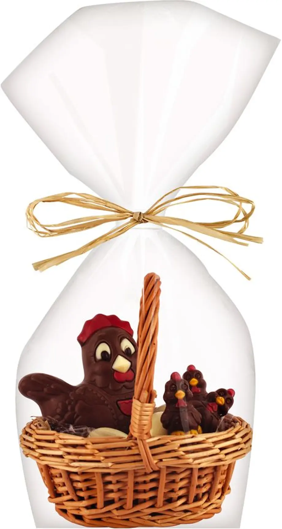 Le panier comprend une poule, des petites poulettes et des oeufs au chocolat blanc et au lait, env. 8€ les 230 g.